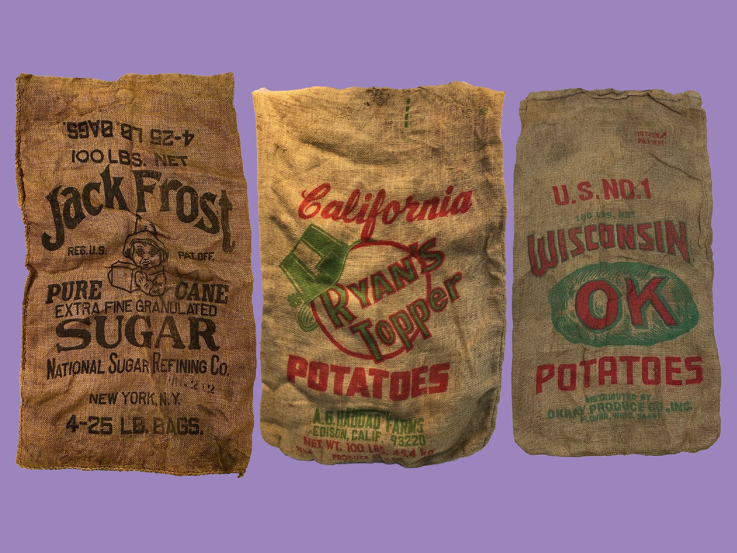 Jack Frost Sugar Bag | California Ryans Toppers Sack | Wisconsin OK Potatoes Sack