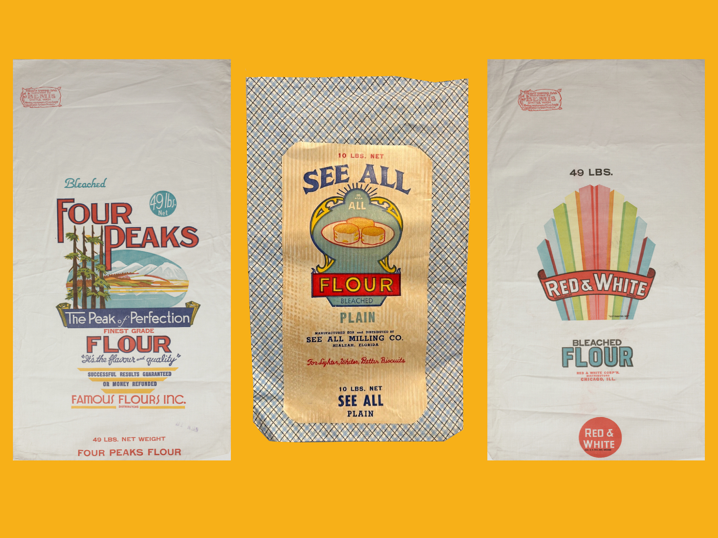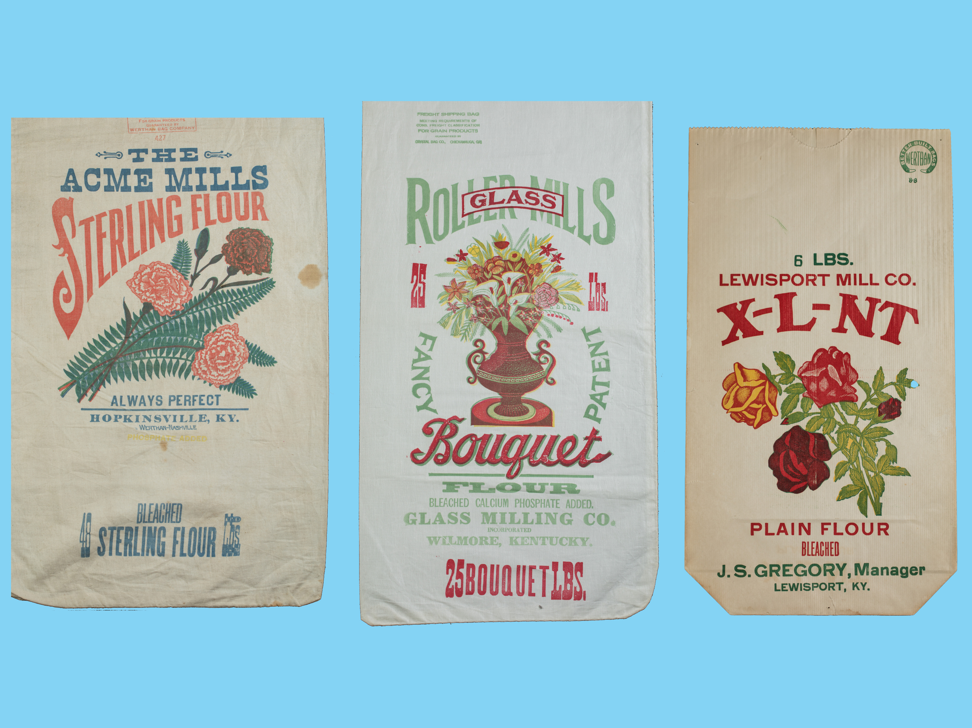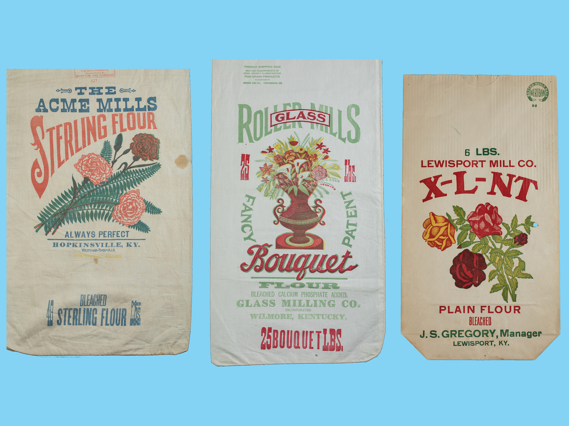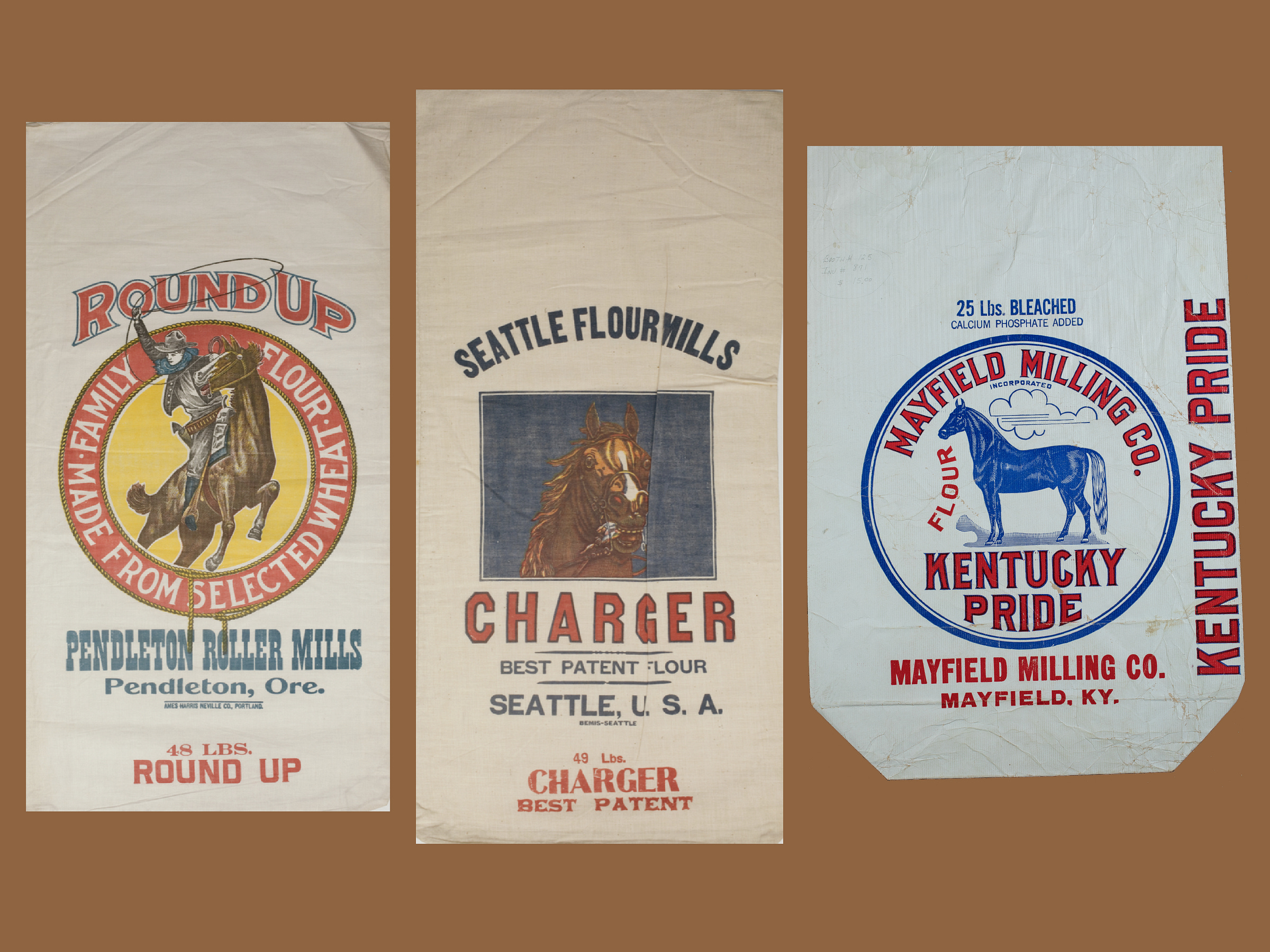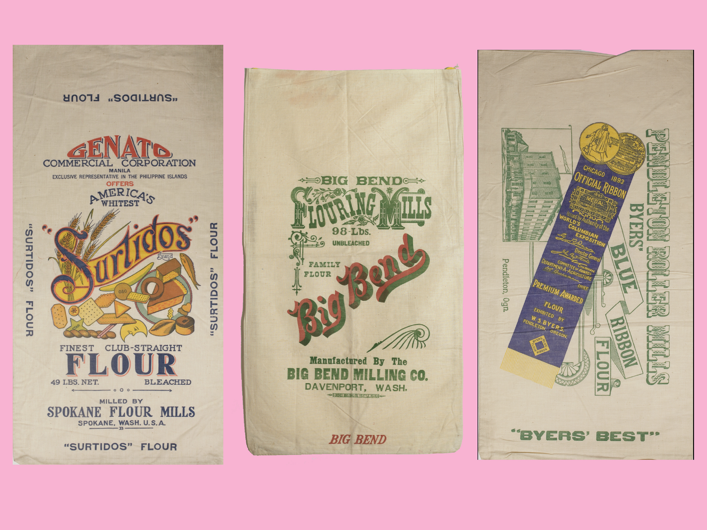 Genato Commercial Corporation Surtidos Flour Sack | Big Bend Milling Company Flour Sack | Pendleton Roller Mills Byers' Blue Ribbon Flour Sack