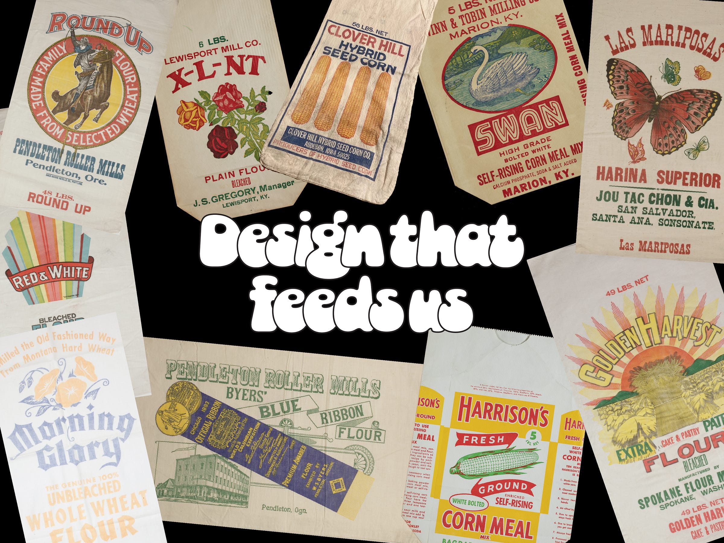 Unfortunately, Ron’s collection is not available digitally but there are lots more videos and articles on him if you’d like to fall down that rabbit hole. Fortunately, there are lots of other feed sacks online! So I’ve gathered a small handful (50+) of my favorites! They’re all linked if you want to take a closer look. And about half of them are for sale on eBay so maybe you’d like to own a piece of design ephemera?? Enjoy!!