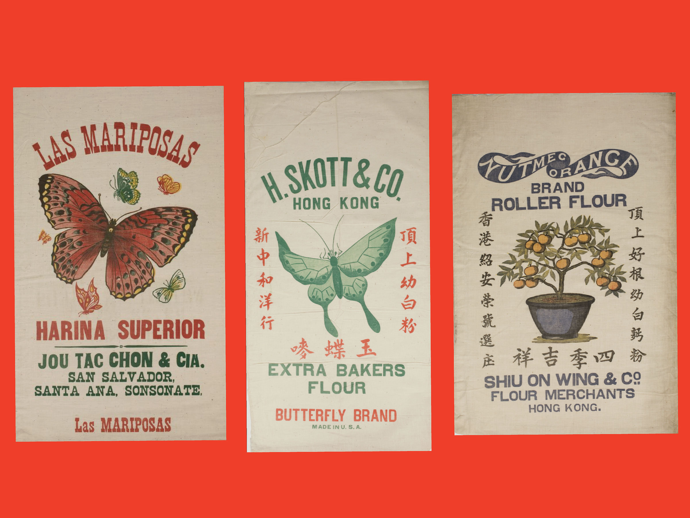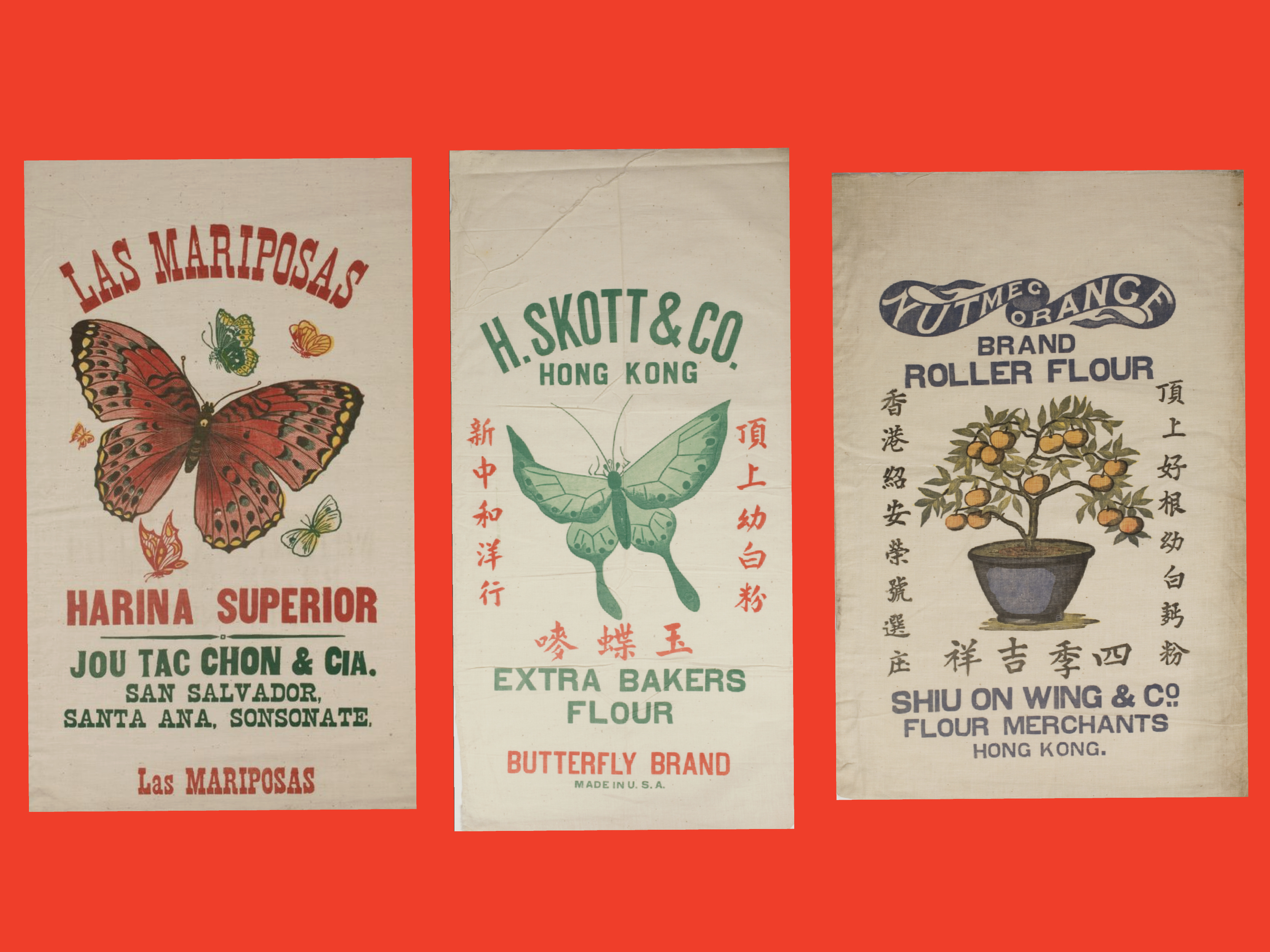 Las Mariposas Harina Superior Flour Sack | H. Skott and Co. Butterfly Brand Flour Sack | Nutmeg Orange Brand Roller Flour Sack