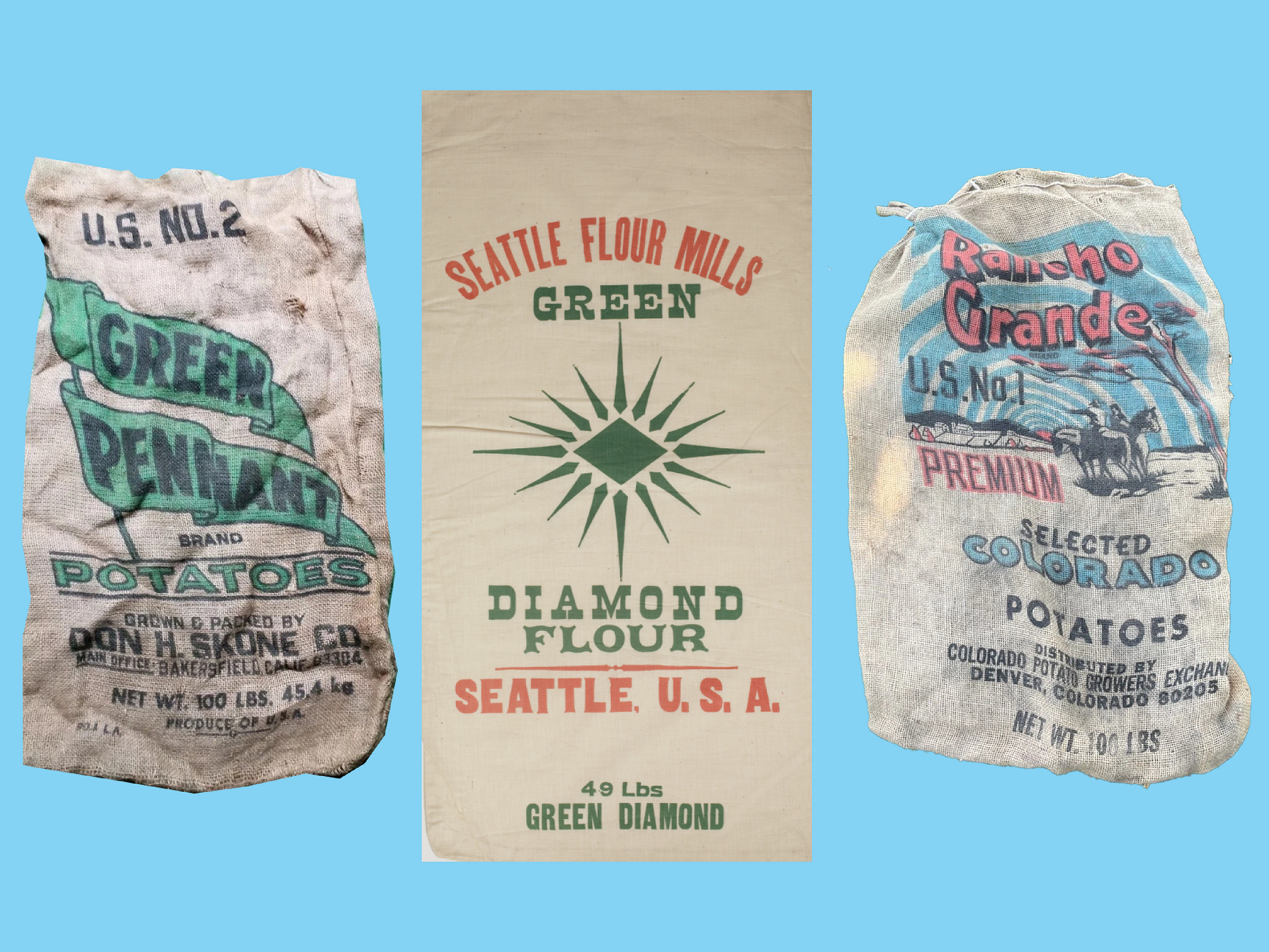 Green Pennant Potato Sack | Green Diamond Flours Sack | Rancho Grande Potato Sack